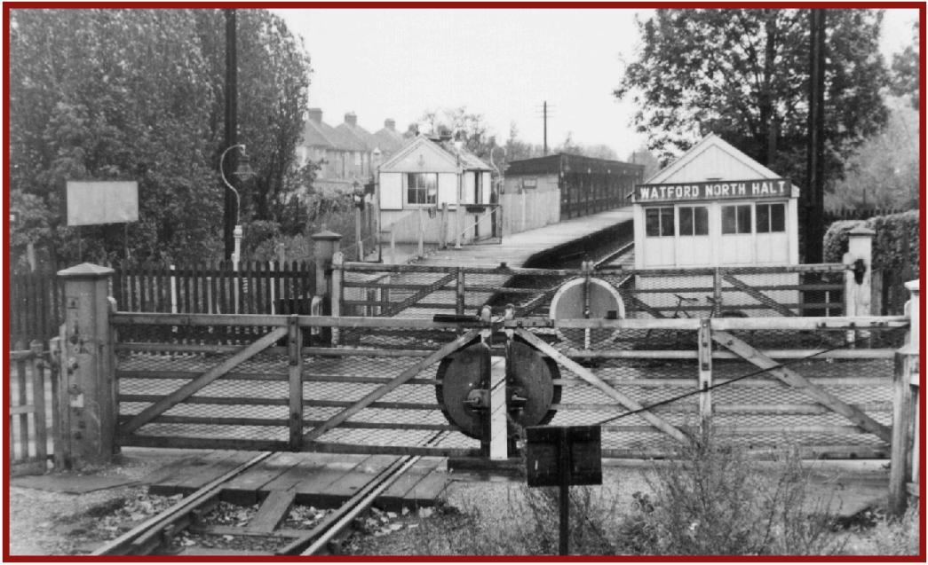 Watford North Halt looking towards Watford. Level Crossing across Bushey Mill Lane